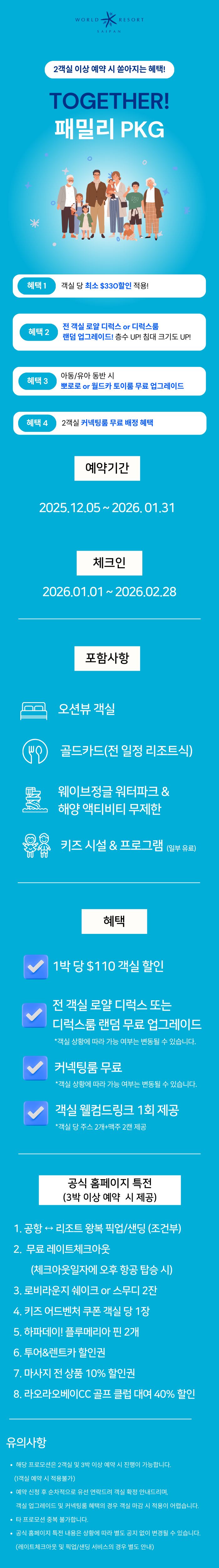 • 공식 홈페이지 특전 내용은 상황에 따라 별도 공지 없이 변경될 수 있습니다. (레이트체크아웃 및 픽업/샌딩 서비스의 경우 별도 안내)
